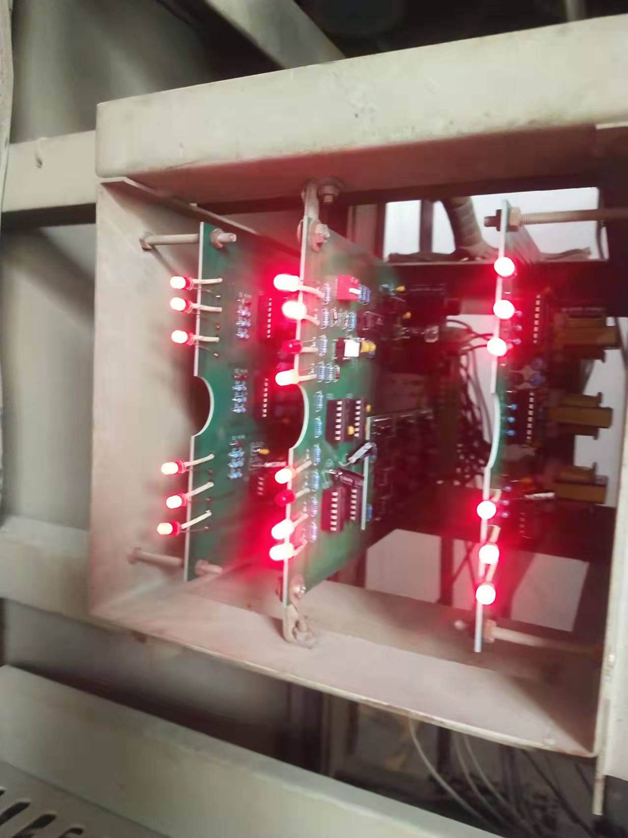 控制板共有三塊,中間一塊一般稱為主控板,兩邊的一般稱為驅(qū)動(dòng)板。控制板更換必須先斷開進(jìn)相器電源,主控板內(nèi)有四個(gè)撥碼開關(guān),其作用是切換進(jìn)相器的運(yùn)行(電機(jī)運(yùn)轉(zhuǎn))和試驗(yàn)狀態(tài)(電機(jī)不運(yùn)轉(zhuǎn)),調(diào)整撥碼開關(guān)時(shí),必須斷開空氣開關(guān)。
